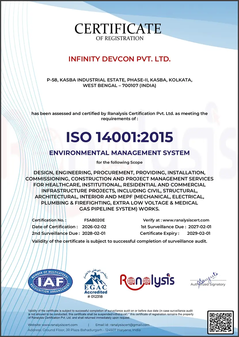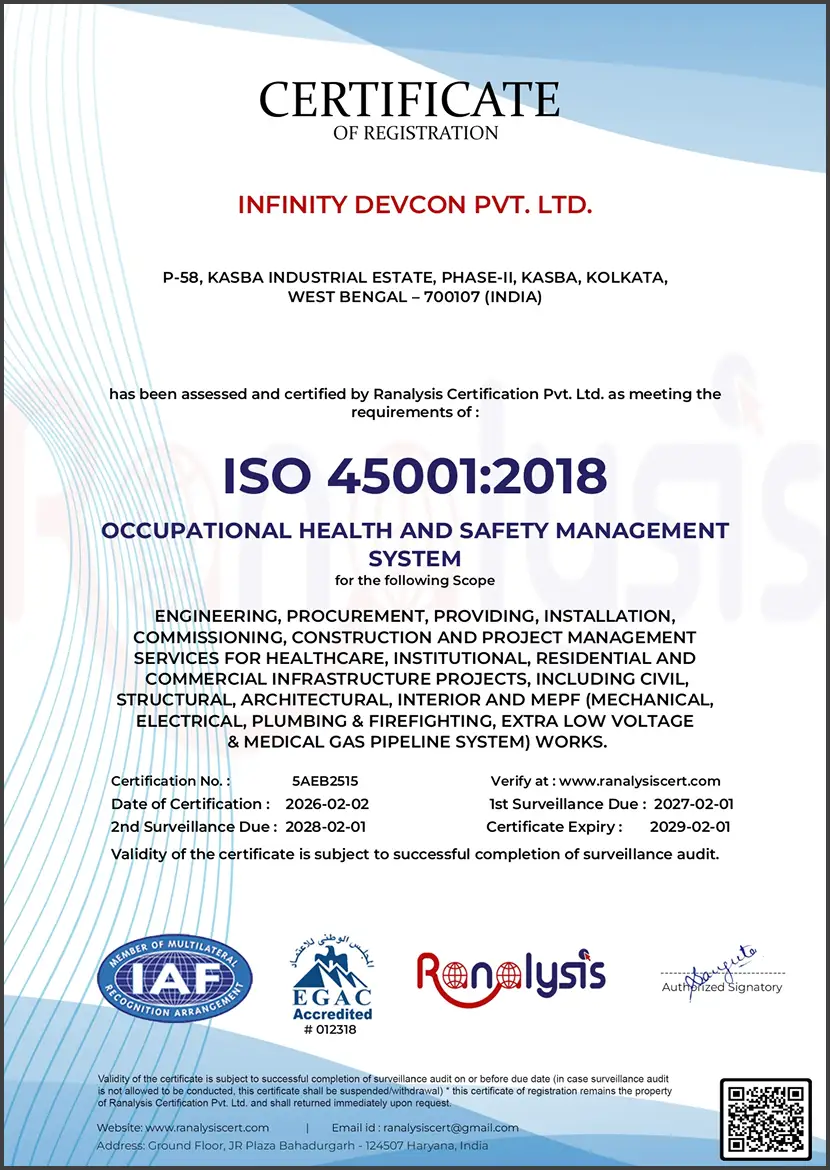 Infinity Devcon Pvt. Ltd. is certified to ISO 9001:2015, ISO 14001:2015 and ISO 45001:2018 by Ranalysis Certification Pvt. Ltd., accredited by EGAC (IAF-MLA signatory)